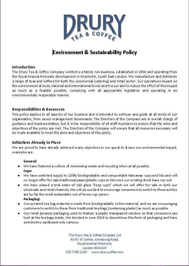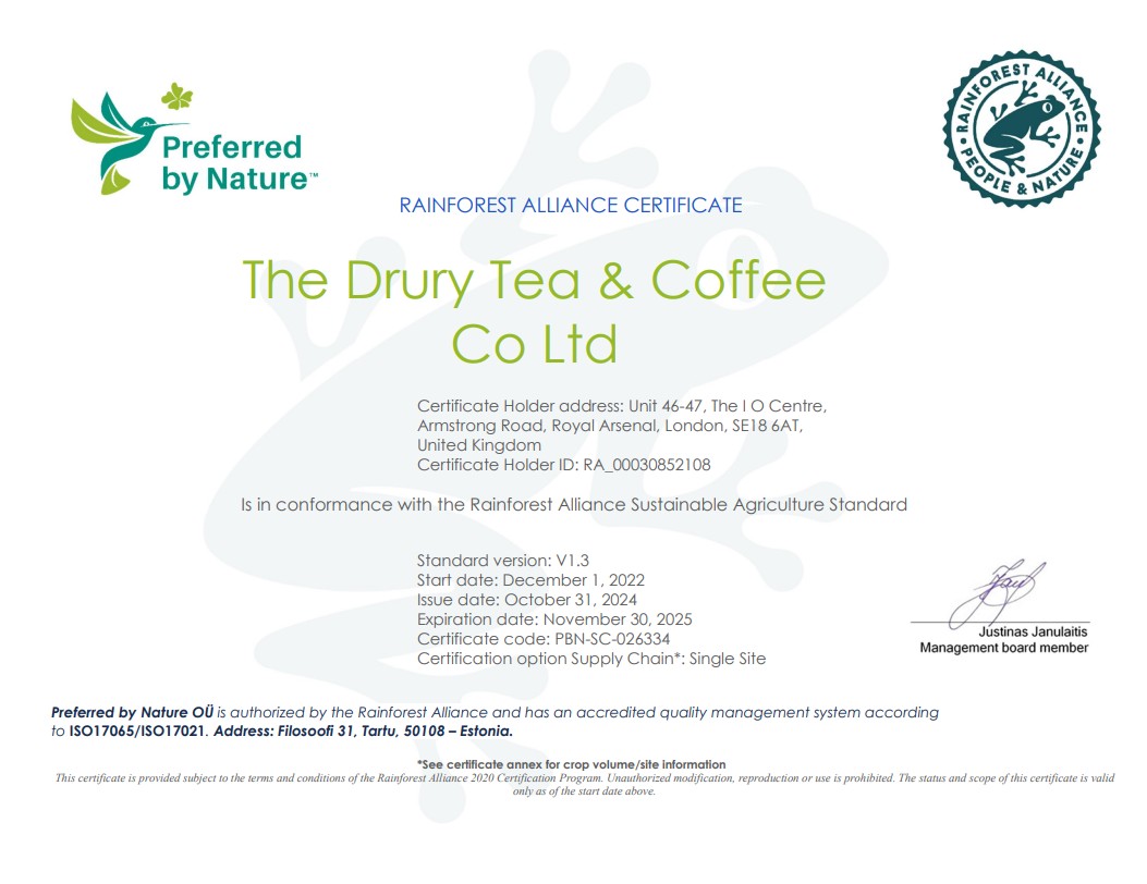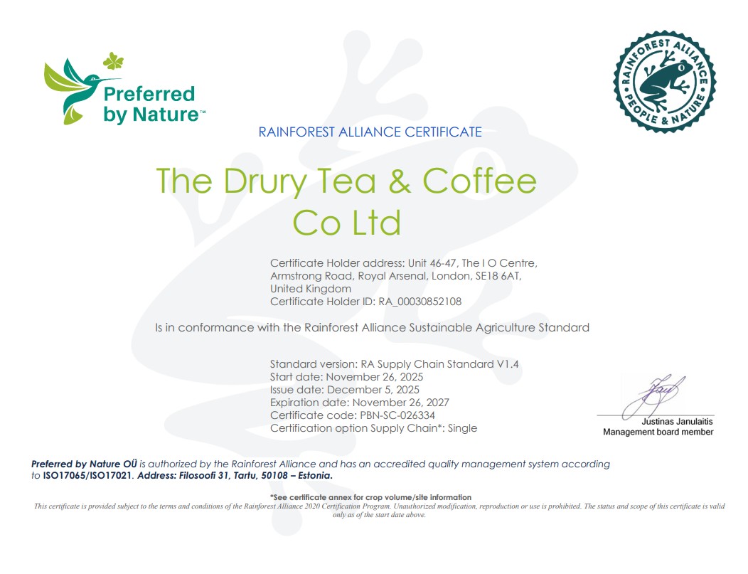 Click on link below to view our current & historic certificates and policies. Food Safety Due DiligenceCMi Certification 2011-2012CMi Certification 2012-2013NCF Certification 2013-2014CMi Certification 2014-2015CMi Certification 2015-2016NCF Certification 2016-2017NCF Certification 2017-2018NSF Certification 2018-2019NSF Certification 2019-2020SALSA Certification 2022-2023SALSA Certification 2023-2024SALSA Certification 2024-2025SALSA Certification 2025-2026 Rainforest AllianceRainforest Alliance Certificate 2013 – 2016Rainforest Alliance Certificate 2016 – 2019Rainforest Alliance Certificate 2019 – 2022Rainforest Alliance Certificate 2022 – 2025Rainforest Alliance Certificate 2025 – 2027 Allergen Modern Slavery Environment & Sustainability Corporate Social Responsibility Policy Equality, Diversity and Inclusion Policy WIP